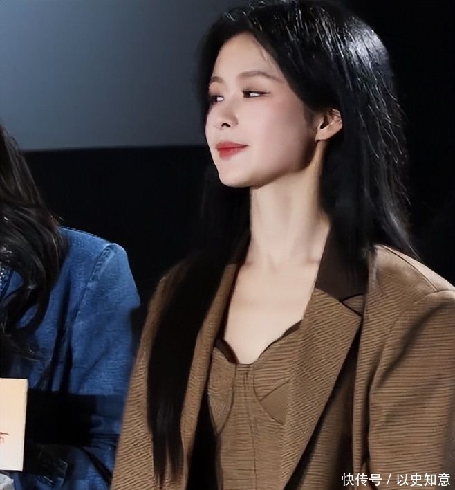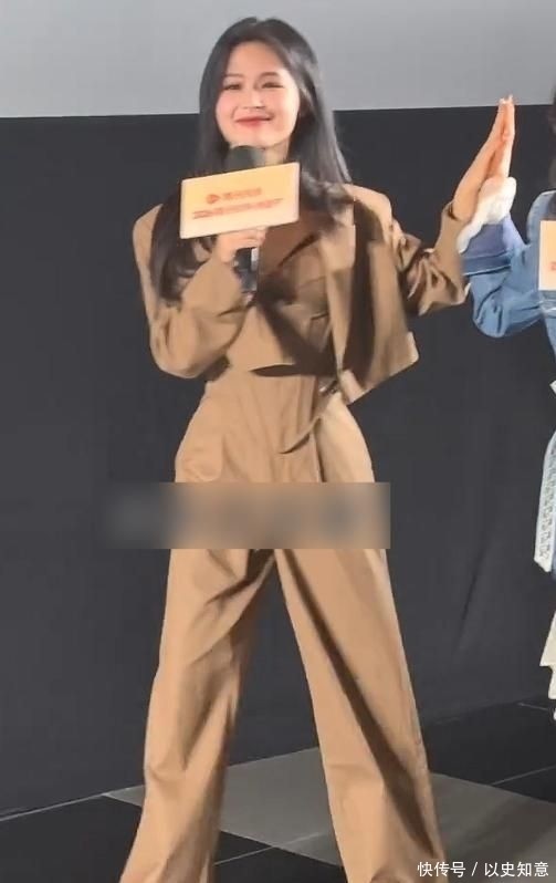 她身着一套复古棕调修身西装套装:上装剪裁利落,勾勒出紧实流畅的肩颈与腰腹线条;下装则选用垂感十足的阔腿西裤,搭配一双约5厘米厚底白色乐福鞋,巧妙优化其165厘米身高比例,整体气场沉稳又不失灵动。